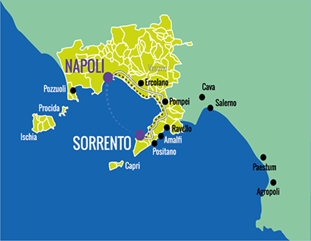 Figure 12 Naples and other spots of interest in the area: Capri, Ischia and Procida (between 30 and 50 minutes), Ercolano and Pompeii (20 and 40 minutes) the Sorrento Peninsula (about one hour), Positano and the Amalfi Coast (just over one hour).